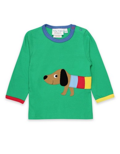 This floppy eared applique pal is keeping cosy in a rainbow jacket – all organic, of course, just like this long-sleeved green T-shirt. The 100% GOTS-certified cotton is cool and comfortable, while contrasting trims add extra colourful style.