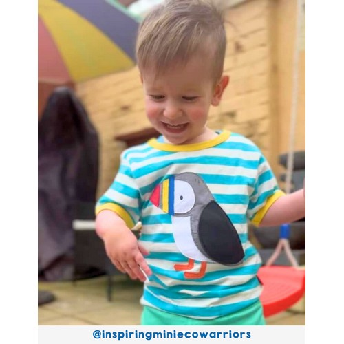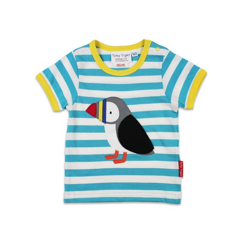 Dress your little one to impress with our adorable Organic Puffin Applique T-Shirt! Featuring timeless blue and white stripes reminiscent of the sea, this shirt is a stylish choice for any playful adventure.