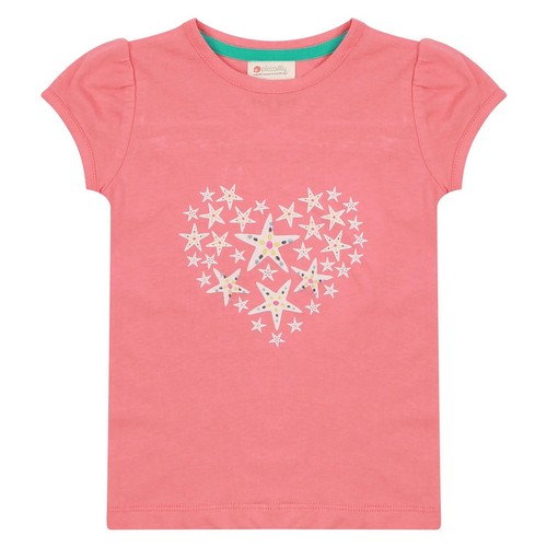 A coral t-shirt featuring a pretty heart motif made up of printed and embroidered starfish. Comes with cap sleeves and made using lighter weight single jersey perfect for warmer weather and summer months. Team this organic t-shirt for children with leggings or skirts.